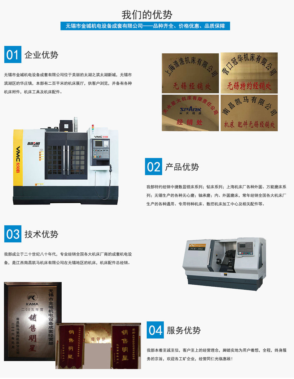 無錫市金城機電設備成套有限公司位于美麗的太湖之濱太湖新城,無錫市濱湖區的華莊鎮,本部有二百平米的機床展廳,供客戶瀏覽,并備有各種機床附件,機床工具及機床配件。 我部成立于二十世紀八十年代,專業經銷全國各大機床廠商的成套機電設備,是江西南昌凱馬機床有限公司在無錫地區的機床,機床配件總經銷。系蘭州里海機床有限公司,天水星火...